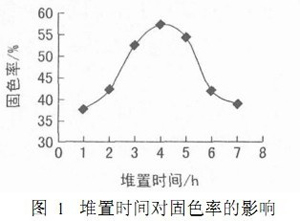 由圖1可知,亞麻織物冷軋堆染色的最佳堆置時間為4h左右。堆置時間未達4h時,染料與纖維發生固色反應占主導地位;4h之后,固色反應基本完成,繼續延長堆置時間,纖維上結合的染料發生水解斷鍵的越來越多,固色率開始下降。
