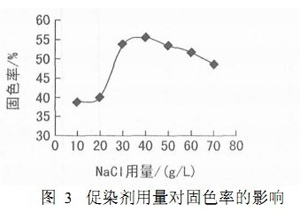 促染劑對活性染料冷軋堆染色也有較大影響。常用的促染劑氯化鈉和硫酸鈉可提高染料的直接性,調節染液中的電解質濃度,提高織物的固色率(圖3)。本試驗采用氯化鈉作促染劑。