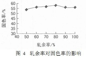 由圖4可知,軋余率對固色率的影響不大。冷軋堆軋余率一般為60%~80%。軋余率要根據織物品種、前處理條件、軋車車速、軋輥硬度、染料/堿劑混合液的黏度和比重等進行適當調整。若染液對織物透芯滲透不夠,應加入滲透劑,不宜采用提高軋壓力的方法,因為提高壓力后,軋余率下降,會使織物出現霜花,進而產生波紋疵病和縫頭印等。