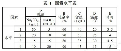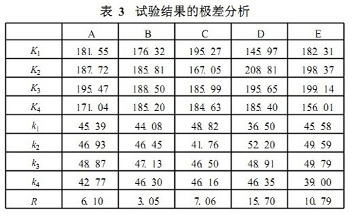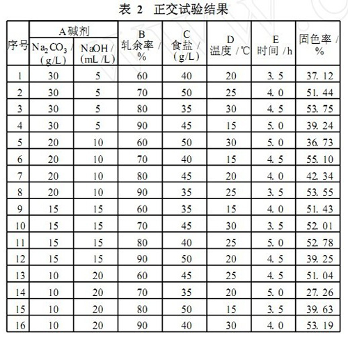 根據單因素對冷軋堆染色固色率的影響分析,采用正交試驗法,以堿劑、堆置時間、堆置溫度、促染劑用量、軋余率為因素,選取單因素試驗時所得到的適宜工藝附近的四個水平值,作五因素四水平正交試驗,見表1,即L(45),試驗結果及極差分析如表2、3所示。