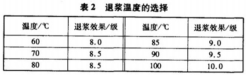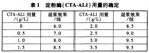 由表1可以看出,隨著淀粉酶CTA—ALl用量增加,漿料的退除效果變好。淀粉酶CTA—ALl用量超過3.0g/L時,淀粉漿料已基本去除,再繼續增加用量,漿料的去除情況變化不大。考慮處理成本,淀粉酶CTA—ALl的最佳用量定為3.0g/L。