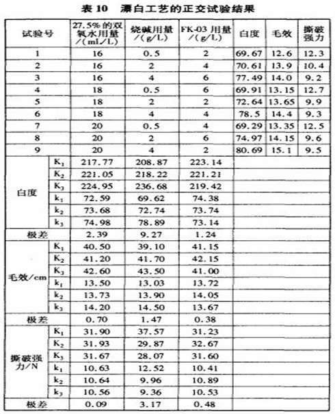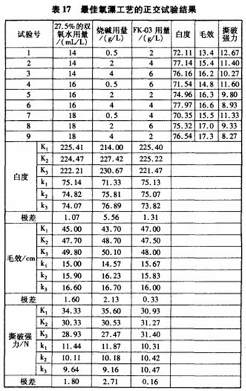 由表l7知,對于白度來說,氫氧化鈉用量的影響最為重要;對毛效和撕破強力來說,影響因素依次為氫氧化鈉用量>雙氧水用量>FK-03用量。綜上,確定最佳工藝為:氫氧化鈉2g/L,雙氧水l4mL/L。FK-034g/L。