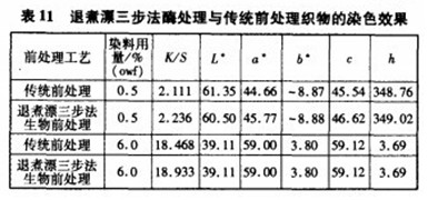 根據表11可知,退煮漂三步法生物前處理與傳統前處理工藝相比,無論染料濃度大小,其染色性能相差甚微,染色效果可以達到應用要求。