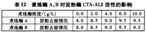 由表l2可以看出,煮練酶A和煮練酶B對淀粉酶CTA-ALl的退漿效果有促進作用,這說明它們對淀粉酶的活性沒有負面影響。