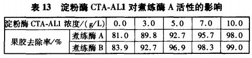 由表l3可以看出,淀粉酶CTA—ALl對煮練酶A和煮練酶B去除果膠有促進作用。綜合表l2~l3,可認為淀粉酶與煮練酶A和煮練酶B的相容性很好。