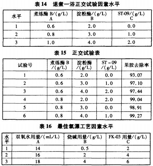 根據表l5得出,對于果膠去除率來說,其影響因素依次為:淀粉酶用量>ST-09用量>煮練酶用量;最佳工藝為:煮練酶用量1.0g/L,淀粉酶用量3.0g/L,ST-09用量1.0g/L,pH值8.5。