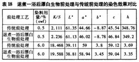 由表l8可以看出,與傳統前處理工藝相比,采用退煮一浴法生物前處理的織物,無論染深色或淺