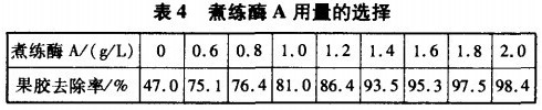 從表4可以看出,隨著煮練酶A用量的增加,果膠去除情況越來越好。根據經驗,果膠去除率達80%以上就可以滿足精練的要求。綜合成本等各因素,煮練酶A的最佳用量定為1.0g/L。