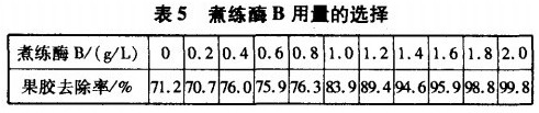 從表5可以看出,隨著煮練酶B用量的增加,果膠去除情況越來越好。綜合成本等各因素,煮練酶B的最佳用量定為1.0g/L。