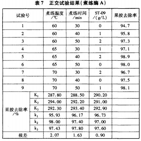 極差大者為主要因素,它的改變對試驗結果影響較大。根據表7,對果膠去除率來說,影響因素的重要性依次為:煮練溫度>煮練時間>酶活促進劑sT—O9的用量;最佳的工藝為:煮練溫度65℃,煮練時間50min,ST一09用量2g/i~。pH值為8.5。