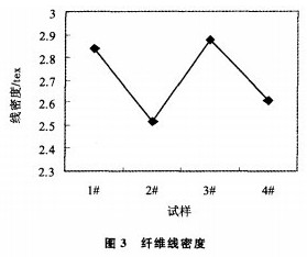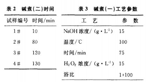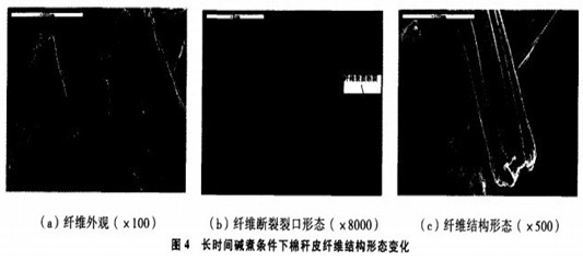 棉稈皮處理條件:以3種處理條件對棉稈皮進行堿煮處理。處理1:條件見表1。處理2:僅僅改變處理1堿煮(二)的時間(表2)。處理3:浸酸條件同表1,不進行堿煮(二)處理,堿煮(一)條件見表3。測試:用日本株式會社產的JSM一5800掃描電子顯微鏡觀察棉稈皮纖維的外觀結構形態的變化。用Y171型纖維切斷器(隔距10mm,上海第七紡織機械廠),JN—A型精密扭力天平,采用中段切斷稱重法嘲測定棉稈皮纖維的線密度。