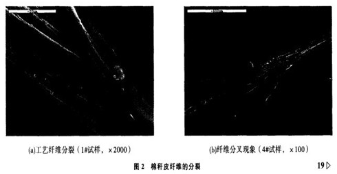 在處理1工藝下,棉稈皮纖維結構形態見圖l。由電鏡觀察得到,棉稈皮纖維表面形態粗糙,不同程度地有縱向縫隙,且纖維呈柬狀。這種結構類似亞麻、黃麻纖維的形態結構,表明棉稈皮纖維也屬工藝纖維。