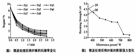 從回潮率變化曲線的總體趨勢看來,在時間一定或者功率一定的情況下,回潮率隨微波時間或者功率的增大而減小。在微波輻照處理0.5min之內,回潮率的變化幅度是最大的。微波處理之后的棉纖維斷裂強力總體趨勢是下降的,但是在特定的微波功率下,即345W功率處理之后試樣的斷裂強力是增大的。此外,微波處理后的試樣與原樣相比,表面都有明顯的微纖構造,但是處理后試樣變得粗糙,且結晶度和晶粒尺寸下降,取向度增大,同時吸濕指數也增大。