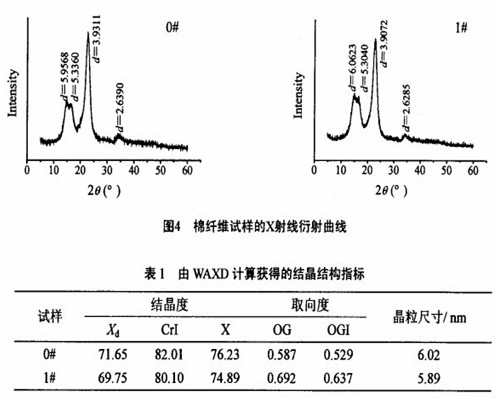 對試樣0#和1#進行廣角x射線衍射(WAXD)分析,圖譜如圖4。計算其結晶度、晶粒尺寸和取向度,結果如表l所示。