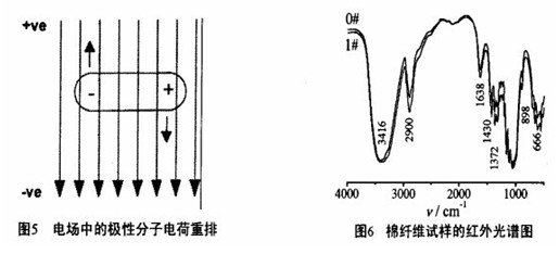 圖6為兩種試樣的傅立葉紅外光譜(FTIR)圖。Ritchter提出了用137lcm吸收峰和665/cm吸收峰的面積之比Al37l/A665)作為纖維素的經驗結晶指數(CI),而1430/cm吸收峰的強度和898cm吸收峰的強度之比(H1430/H898)常常定義為側向有序指數(LOI),與纖維素I的比例相關,不能用于含纖維素II的樣品,表示晶粒的側向有序指數。將1638/cm吸收峰和898/cm吸收峰的面積之比(A163/A898)定義為吸濕指數(MI)。由表2的計算結果可知,試樣l#的cI和LOI均比試樣0小,這與X射線衍射圖分析結果一致。計算其吸濕指數MI可知,試樣1#高于0#,這是因為經過微波處理之后,結晶度下降,無定型區尺寸增加,而且表面粗糙度增加,使得吸濕指數增大。