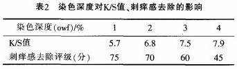 因此,染色深度增大,織物得色量增加,同時,染色深度增大,減弱了酶的活性,水解、降解作用減弱.刺癢感去除效果下降。