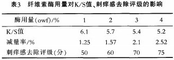 采用不同用量的生物酶。在活性BES紅(owf)3%、元明粉50g/L、染色溫度55~60℃、pH值6~6.5、染色時間20min、碳酸鈉20g/L、固色溫度60℃、固色時間50min、浴比1:15條件下,研究其對織物K/S值、刺癢感去除評級的影響效果,結果如表3所示。
