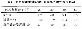 在纖維素酶(0)3%,活性BES紅(owf)3%、染色溫度55~60、pH值66.5、染色時間2Omin、碳酸納20g/L、固色溫度60cc、固色時間50min、浴比1:15的條件下.研究不同用量的元明粉其對織物K/S值、刺癢感去除評級的影響效果,結果如表4所示。