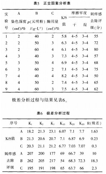 從上面的試驗可以看出.固定碳酸鈉的用量,刺癢感的強弱及得色量與染色深度、纖維素酶用量、元明粉用量有密切的關系。為了進一步研究各因素對刺癢感、得色量的綜合影響,運用正交設計進行分析因素、水平設計及試驗結果如表5所示。