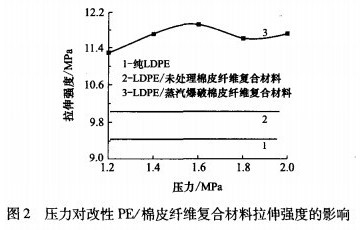 在溫度23℃、濕度55%、拉伸速度為100mm/min的條件下,進(jìn)行樣條的拉伸性能測(cè)試。圖2是壓力對(duì)改性PE/棉皮纖維復(fù)合材料拉伸強(qiáng)度的影響(棉皮纖維質(zhì)量分?jǐn)?shù)為15%)。由圖2可得,純PE拉伸強(qiáng)度為9.4MPa。與純PE相比,改性PE/棉皮纖維復(fù)合材料的拉伸性能分別提高了19.5%(壓力為1.2MPa)和24.0%(壓力為2.0MPa)。未處理PE/棉皮纖維復(fù)合材料的拉伸強(qiáng)度為10.0MPa。經(jīng)過蒸汽爆破預(yù)處理的棉皮纖維拉伸強(qiáng)度由11.3MPa(壓力為1.2MPa)增加到了11.7MPa(壓力為2.0MPa),分別比未處理試樣增加了12.3%和16.6%,分析其原因是蒸汽爆破預(yù)處理改變了棉皮纖維結(jié)構(gòu),提高了纖維表面粗糙度,增大了棉皮纖維與相容劑的接觸面積,從而改善了棉皮纖維與PE的界面黏結(jié)性,這樣使極富韌性的棉皮纖維與PE更好黏合,復(fù)合材料拉伸性能得到提高。