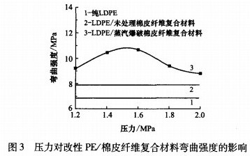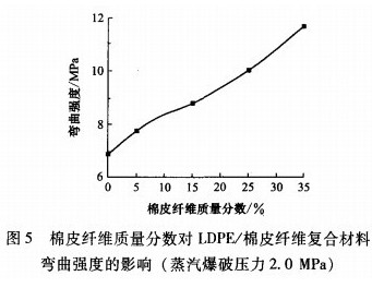 圖5是棉皮纖維質(zhì)量分?jǐn)?shù)對(duì)LDPE/棉皮纖維復(fù)合材料彎曲強(qiáng)度的影響(蒸汽爆破壓力