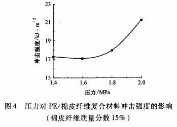 一般情況下,在塑料中填充高質(zhì)量分?jǐn)?shù)的未處理棉皮纖維,棉皮纖維容易團(tuán)聚,與塑料的相容性差,容易造成應(yīng)力集中,沖擊性能差。圖4是爆破壓力對(duì)PE/棉皮纖維復(fù)合材料沖擊強(qiáng)度的影響(棉皮纖維質(zhì)量分?jǐn)?shù)15%)。由圖4看出,隨著蒸汽爆破壓力的增強(qiáng),沖擊性能增強(qiáng)。分析其原因是在一定爆破壓力條件下,棉皮纖維的內(nèi)部整體結(jié)構(gòu)被破壞,各組織成分松散,棉皮纖維與PE的接觸面積增加,且改性后棉皮纖維長徑比提高,從而提高了復(fù)合材料的沖擊強(qiáng)度。結(jié)果表明,爆破壓力越大,對(duì)物料的破壞力就越大,越能夠?qū)崿F(xiàn)棉皮纖維的高效分離而改善沖擊性能。