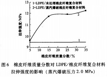圖6是棉皮纖維質(zhì)量分?jǐn)?shù)對(duì)LDPE/棉皮纖維復(fù)合材料拉伸強(qiáng)度的影響(蒸汽爆破壓力2.0MPa)。由圖6看出,隨著棉皮纖維質(zhì)量分?jǐn)?shù)的增加,拉伸強(qiáng)度增強(qiáng)。當(dāng)棉皮纖維質(zhì)量分?jǐn)?shù)為35%時(shí),拉伸強(qiáng)度比純LDPE增強(qiáng)了29.6%。說明蒸汽爆破后的具有一定長徑比的棉皮纖維作為一種增強(qiáng)劑可以改善材料的拉伸性能。