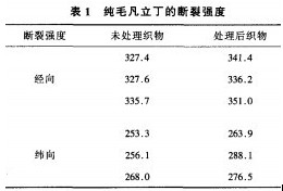 由表1可見,純毛凡立丁在pH值11,60℃條件下處理30min后,其斷裂強度沒有下降。