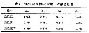 通過調節染毛過程中染浴的pH值,使棉織物和毛織物盡量減少色差,最終確定對毛進行染色的pH值為7,染色結束后將棉織物與毛織物分別進行測試,并以毛織物為標準計算色差,結果見表2。