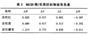經過多次實驗,80/20棉/毛織物一浴染色在染毛階段pH值為5~6時,染色結束后,分別測試棉、毛織物,以毛織物為標準計算色差,結果見表3。