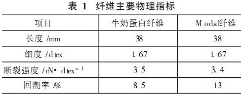 牛奶蛋白纖維為淡黃色,單纖斷裂強(qiáng)度較大,而濕態(tài)下強(qiáng)度損失較小;初始模量較大,具有良好的保形性,但彈性回復(fù)性較差,質(zhì)量比電阻較大,靜電現(xiàn)象嚴(yán)重,纖維單獨(dú)成卷成條困難,為此,Modal纖維與牛奶蛋白纖維混紡針織紗線采用棉包混和紡紗方法。