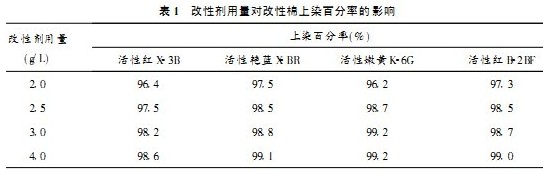 由表1可看出,當氫氧化鈉用量為2.0g/L,改性劑用量由2.0g/L增大到4.0g/L時,染料對改性棉的上染百分率隨改性劑用量的增多而增大。這是因為,隨著改性劑用量的增加,與纖維發生反應的量也在增加,因此上染到纖維上的染料量增多,染料的上染百分率提高。但當改性劑用量增大到2.5g/L后,若繼續增大改性劑用量,上染百分率的變化并不大,因此改性劑用量以2.5g/L為佳。
