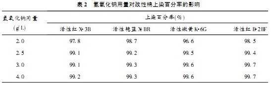 當改性劑用量為2.5gL時,棉織物在氫氧化鈉用量分別為2.0gL、2.5gL、3.0gL、4.0gL的改性液中改性處理后,再進行中性、無鹽染色,結果見表2。