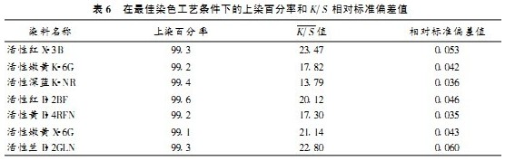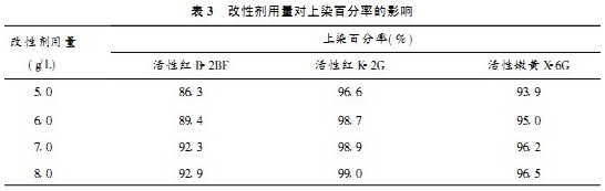 從表3可以看出,當堿劑用量不變時,隨著改性劑用量的增加,染料的上染百分率得到較明顯的提高;但當改性劑用量從7.0g/L增大到8.0g/L時,染料上染百分率變化不大,由此得出結論,改性劑的最佳用量為7.0g/L。