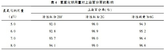 當棉織物在改性劑用量為7.0g/L,氫氧化鈉用量分別為5.0g/L、6.0g/L、7.0g/L、8.0g/L的改性液中改性處理后,再進行中性、無鹽染色,結果見表4。
