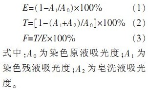 由表1、表2 可知,利用弱酸性染料對羊毛角蛋白改性黏膠纖維染色,其上染率很低,尤其是普拉藍(lán)RAWL 對羊毛角蛋白改性黏膠纖維的上染率最低。毛用活性染料對羊毛角蛋白改性黏膠纖維的染色上染率、固色率及固著效率也比較低,其中蘭納素黃對羊毛角蛋白改性黏膠纖維上染率最低。汽巴克隆FN 型活性染料對其具有較好的上染性能,所得色澤較深而且具有較好的色澤和手感。