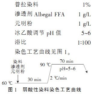染化料:無水碳酸鈉(北京化工廠)、無水硫酸鈉(天津塘沽鄧中化工廠)、汽巴蓬勃R、Albegal FFA(亨斯邁公司)、125% 普拉紅B、160% 普拉黃4G、150%普拉藍(lán)RAWL(偶氮類,亨斯邁公司)、汽巴克隆黃FN-2R、汽巴克隆紅