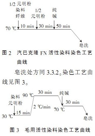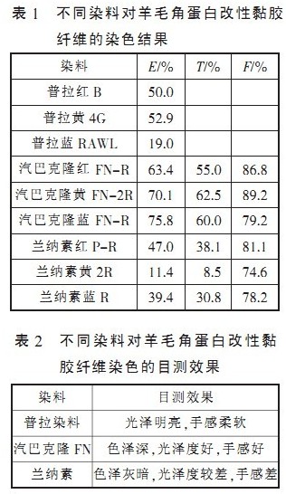 這是因?yàn)閷?shí)驗(yàn)所用羊毛角蛋白改性黏膠纖維中羊毛角蛋白的含量相對較少(13%左右),其具有的與弱酸性染料或毛用活性染料相結(jié)合的基團(tuán)相對較少,不適合用弱酸性染料或毛用活性染料染色;而汽巴克隆FN 型活性染料屬于棉用活性染料,由于被