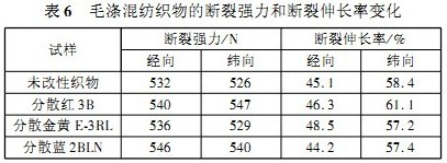 染色后毛滌混紡織物的斷裂強力和斷裂伸長率,如表6所示。