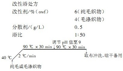 (1)羊毛織物和毛滌織物經(jīng)合成的改性劑改性后,可以用分散染料常壓一浴法染色。染色織物的皂洗和摩擦牢度能夠達到3級以上;改性后的織物染色后,經(jīng)緯向強力均有提高。