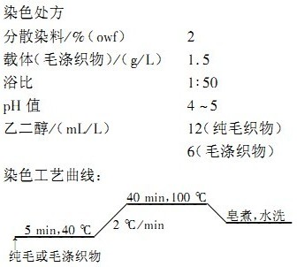 (3)改性毛滌織物較合適的染色條件:染料2%(owf),載體1.5g/l,乙二醇12ml/l,染色溫度100℃,染色時間60min。