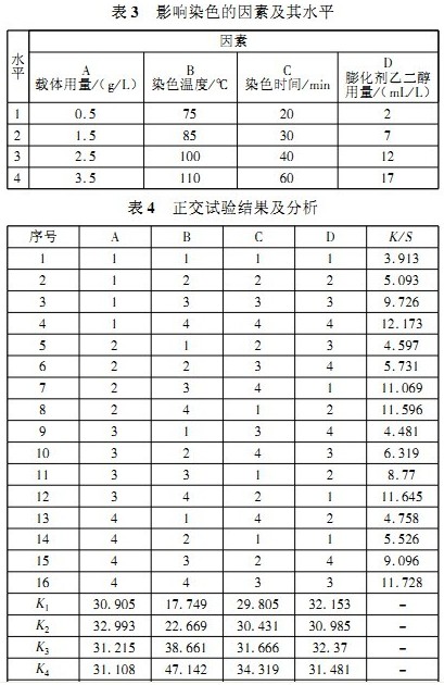 按表3、4設計的四因素四水平,用2%(owf)分散藍2BLN對毛滌混紡織物進行染色,測試染色織物K/S值,并據(jù)此對改性毛滌織物的染色工藝進行優(yōu)化。