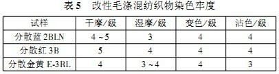 從表5可知,改性后的毛滌織物染色牢度均達到3級或3級以上,說明其與分散染料的結合力增大。