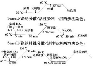 (2)Seacell/滌綸針織物適宜采用分散/活性高溫高壓一浴兩步法染色工藝,染色時兩種染料先以高溫常規工藝染色,再降溫,加堿,使活性染料在Seacell纖維上固著。此工藝節能降耗。