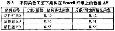 表3為ED型活性染料在不同染色工藝下對Seacell纖維和Seacell/滌綸染色織物的色差,以活性染料常規染色的布樣為標樣。