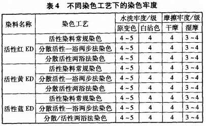(1)Seacell/滌綸針織物染色時,滌綸部分采用分散染料,Seacell纖維則采用活性ED型染料,其在Seacell纖維上的固色率可達到80%以上,水洗牢度4~5級,干摩擦牢度4—5級,濕摩擦牢度3.5—4級。
