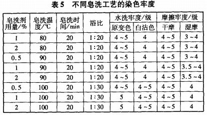 表5中,通過增大皂洗劑用量,提高皂洗溫度及加大浴比,色牢度可以提高0.5級,但從實際需要考慮,選擇皂洗劑用量為1%~2%,溫度90℃,時間20min,浴比1:20,即可達到要求。實際生產中,根據織物顏色深淺可以作適當調整。