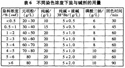 以固色率達到80%以上,色牢度≥3.5級為衡量標準,按照2.2節及2.3節中所確定的染色及皂洗工藝,試驗確定不同染料濃度下鹽與堿劑的用量,見表6。