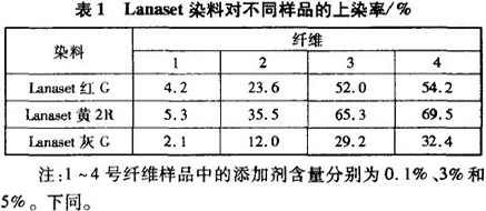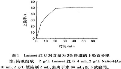 測(cè)定Lanaset紅G對(duì)添加劑含量為3%的纖維(以下試驗(yàn)同)的上染率曲線,如圖1所示。