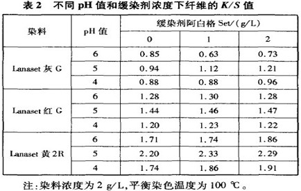 (4)染色pH值5、緩染劑用量2 g/L時(shí),纖維得色較深,勻染性較好。